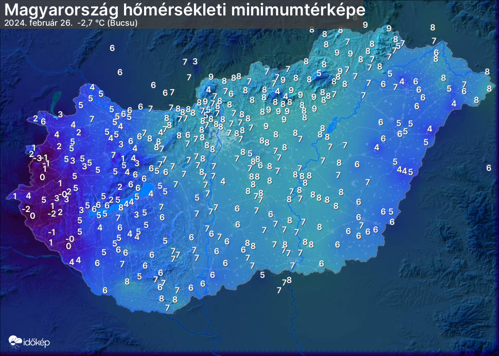 A minimumtérképen kirajzolódik az adott éjszaka mért legalacsonyabb hőmérsékletek térbeli eloszlása. Az adott nap hőmérsékleti minimumát télen előző este 7 és aznap reggel 7 óra, nyáron előző este 8 és aznap reggel 8 óra között mért legalacsonyabb értékkel adjuk meg. Adatbeküldés: aznap délután 4 óráig.