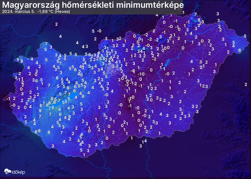 A minimumtérképen kirajzolódik az adott éjszaka mért legalacsonyabb hőmérsékletek térbeli eloszlása. Az adott nap hőmérsékleti minimumát télen előző este 7 és aznap reggel 7 óra, nyáron előző este 8 és aznap reggel 8 óra között mért legalacsonyabb értékkel adjuk meg. Adatbeküldés: aznap délután 4 óráig.