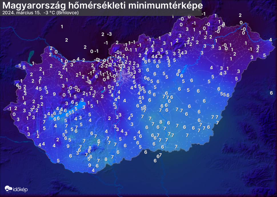 A minimumtérképen kirajzolódik az adott éjszaka mért legalacsonyabb hőmérsékletek térbeli eloszlása. Az adott nap hőmérsékleti minimumát télen előző este 7 és aznap reggel 7 óra, nyáron előző este 8 és aznap reggel 8 óra között mért legalacsonyabb értékkel adjuk meg. Adatbeküldés: aznap délután 4 óráig.