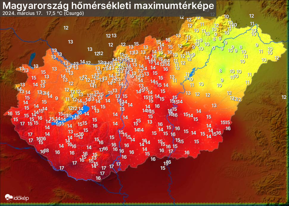 A maximumtérképen kirajzolódik az adott napon mért legmagasabb hőmérsékletek térbeli eloszlása. Az adott nap hőmérsékleti maximumát télen reggel és este 7 óra, nyáron reggel és este 8 óra között mért legmagasabb értékkel adjuk meg. Adatbeküldés: következő nap reggel 4 óráig.