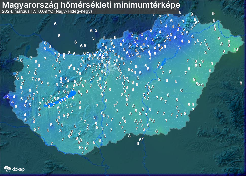 A minimumtérképen kirajzolódik az adott éjszaka mért legalacsonyabb hőmérsékletek térbeli eloszlása. Az adott nap hőmérsékleti minimumát télen előző este 7 és aznap reggel 7 óra, nyáron előző este 8 és aznap reggel 8 óra között mért legalacsonyabb értékkel adjuk meg. Adatbeküldés: aznap délután 4 óráig.