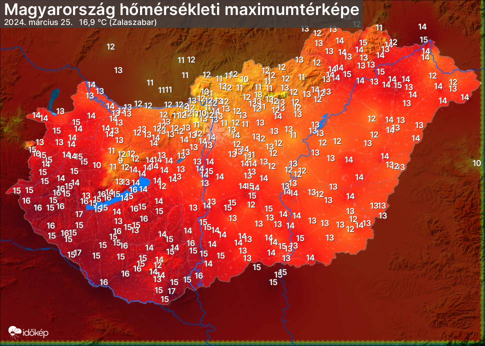 A maximumtérképen kirajzolódik az adott napon mért legmagasabb hőmérsékletek térbeli eloszlása. Az adott nap hőmérsékleti maximumát télen reggel és este 7 óra, nyáron reggel és este 8 óra között mért legmagasabb értékkel adjuk meg. Adatbeküldés: következő nap reggel 4 óráig.