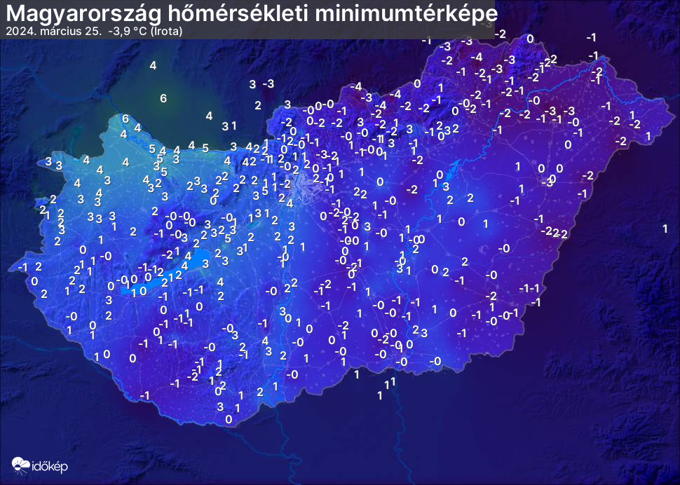 A minimumtérképen kirajzolódik az adott éjszaka mért legalacsonyabb hőmérsékletek térbeli eloszlása. Az adott nap hőmérsékleti minimumát télen előző este 7 és aznap reggel 7 óra, nyáron előző este 8 és aznap reggel 8 óra között mért legalacsonyabb értékkel adjuk meg. Adatbeküldés: aznap délután 4 óráig.