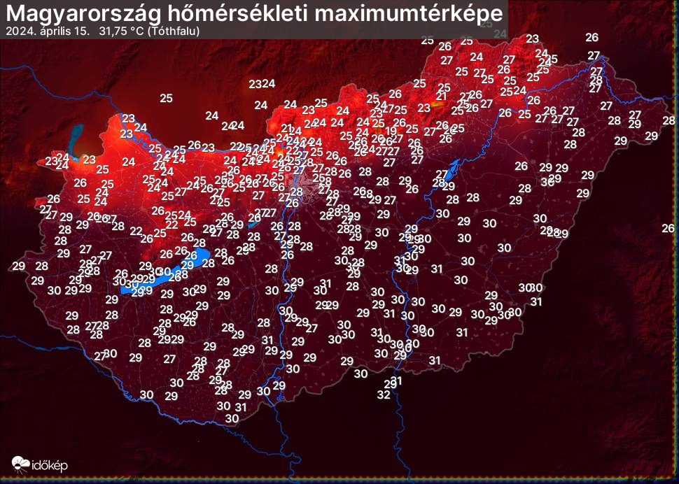 A maximumtérképen kirajzolódik az adott napon mért legmagasabb hőmérsékletek térbeli eloszlása. Az adott nap hőmérsékleti maximumát télen reggel és este 7 óra, nyáron reggel és este 8 óra között mért legmagasabb értékkel adjuk meg. Adatbeküldés: következő nap reggel 4 óráig.