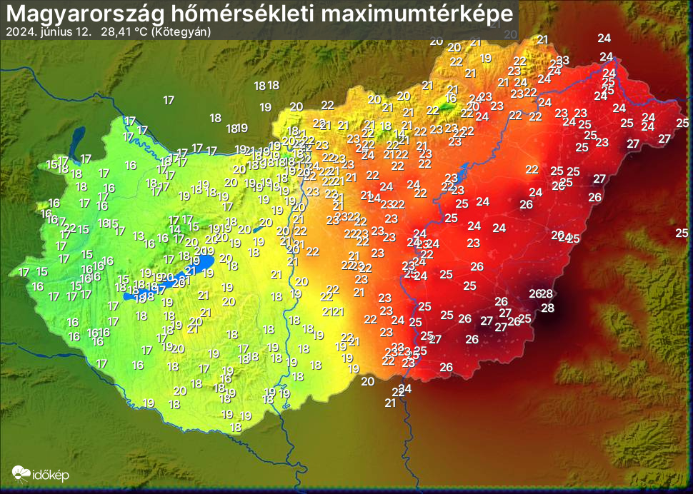 A maximumtérképen kirajzolódik az adott napon mért legmagasabb hőmérsékletek térbeli eloszlása. Az adott nap hőmérsékleti maximumát télen reggel és este 7 óra, nyáron reggel és este 8 óra között mért legmagasabb értékkel adjuk meg. Adatbeküldés: következő nap reggel 4 óráig.