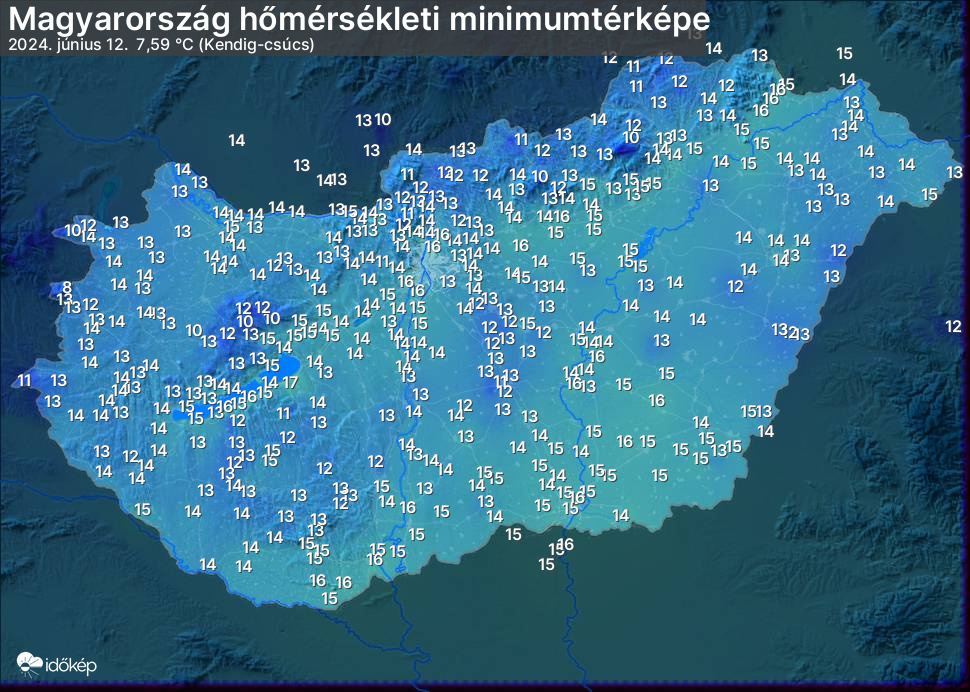 A minimumtérképen kirajzolódik az adott éjszaka mért legalacsonyabb hőmérsékletek térbeli eloszlása. Az adott nap hőmérsékleti minimumát télen előző este 7 és aznap reggel 7 óra, nyáron előző este 8 és aznap reggel 8 óra között mért legalacsonyabb értékkel adjuk meg. Adatbeküldés: aznap délután 4 óráig.