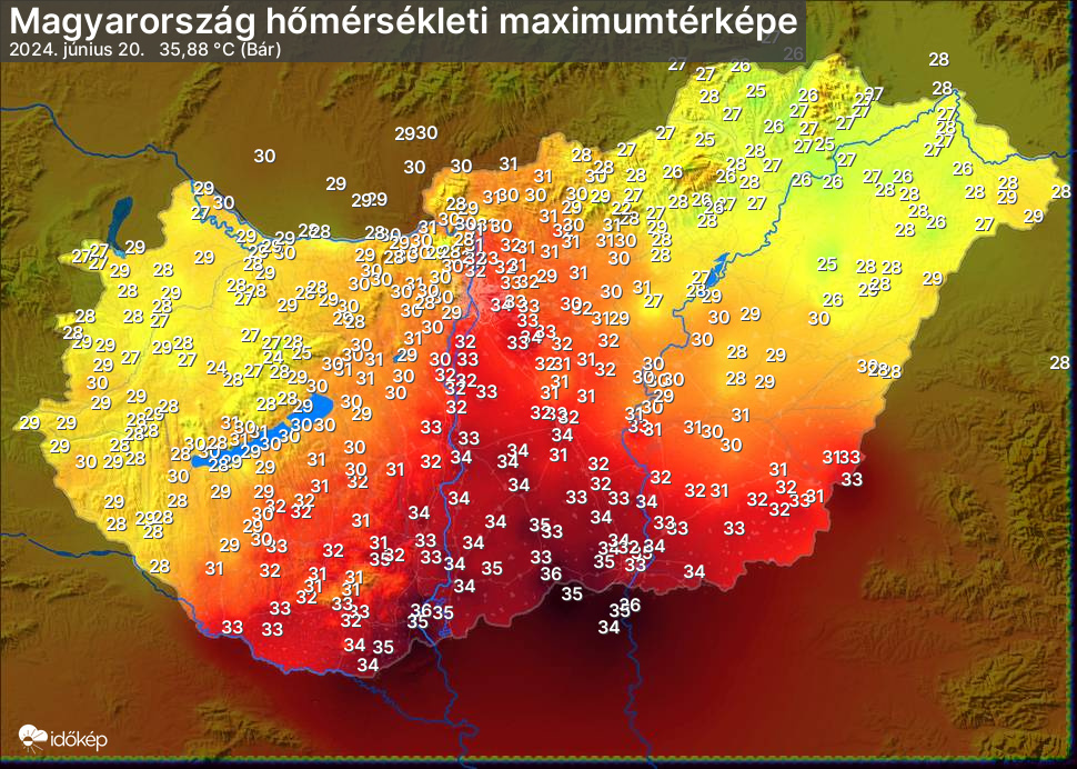 A maximumtérképen kirajzolódik az adott napon mért legmagasabb hőmérsékletek térbeli eloszlása. Az adott nap hőmérsékleti maximumát télen reggel és este 7 óra, nyáron reggel és este 8 óra között mért legmagasabb értékkel adjuk meg. Adatbeküldés: következő nap reggel 4 óráig.