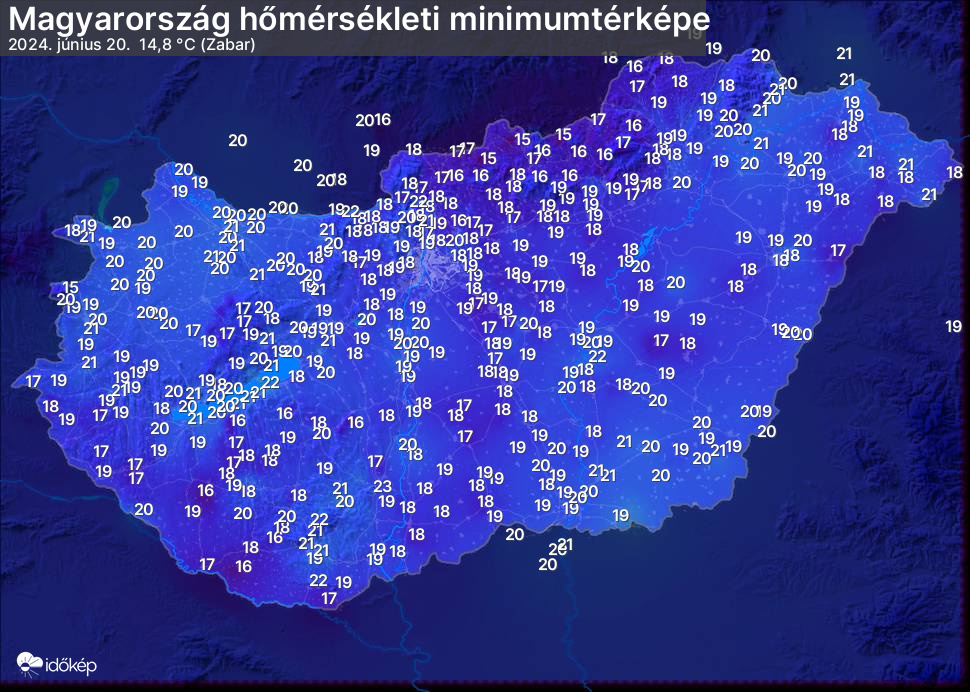 A minimumtérképen kirajzolódik az adott éjszaka mért legalacsonyabb hőmérsékletek térbeli eloszlása. Az adott nap hőmérsékleti minimumát télen előző este 7 és aznap reggel 7 óra, nyáron előző este 8 és aznap reggel 8 óra között mért legalacsonyabb értékkel adjuk meg. Adatbeküldés: aznap délután 4 óráig.