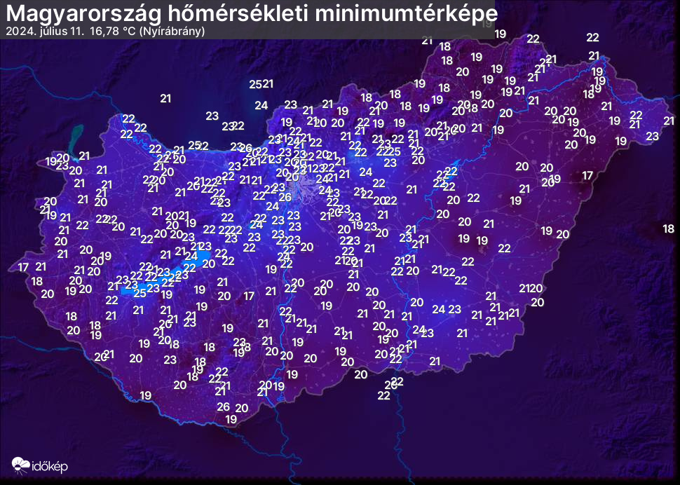 A minimumtérképen kirajzolódik az adott éjszaka mért legalacsonyabb hőmérsékletek térbeli eloszlása. Az adott nap hőmérsékleti minimumát télen előző este 7 és aznap reggel 7 óra, nyáron előző este 8 és aznap reggel 8 óra között mért legalacsonyabb értékkel adjuk meg. Adatbeküldés: aznap délután 4 óráig.