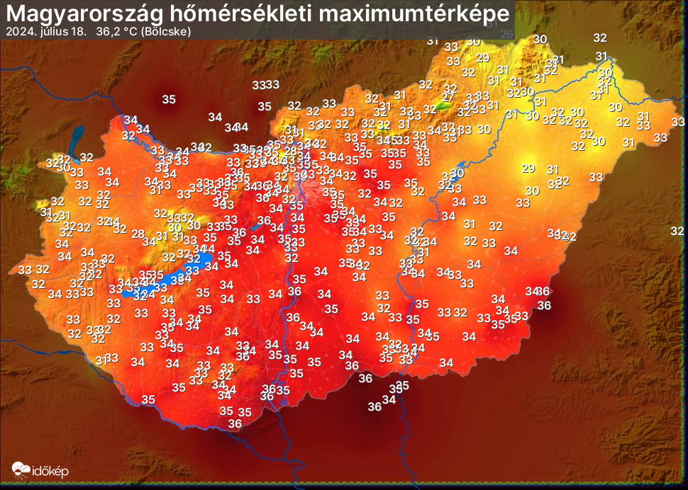 A maximumtérképen kirajzolódik az adott napon mért legmagasabb hőmérsékletek térbeli eloszlása. Az adott nap hőmérsékleti maximumát télen reggel és este 7 óra, nyáron reggel és este 8 óra között mért legmagasabb értékkel adjuk meg. Adatbeküldés: következő nap reggel 4 óráig.
