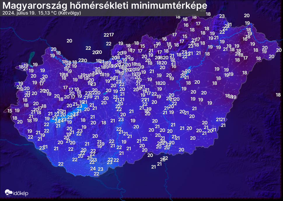 A minimumtérképen kirajzolódik az adott éjszaka mért legalacsonyabb hőmérsékletek térbeli eloszlása. Az adott nap hőmérsékleti minimumát télen előző este 7 és aznap reggel 7 óra, nyáron előző este 8 és aznap reggel 8 óra között mért legalacsonyabb értékkel adjuk meg. Adatbeküldés: aznap délután 4 óráig.