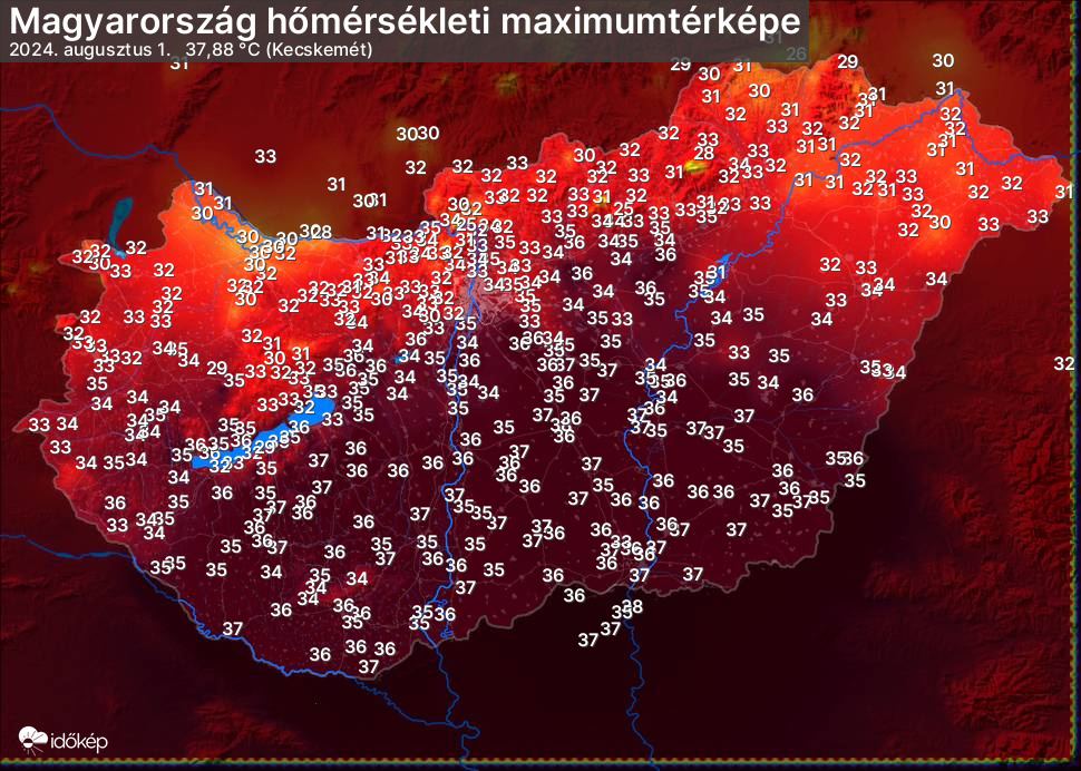 A maximumtérképen kirajzolódik az adott napon mért legmagasabb hőmérsékletek térbeli eloszlása. Az adott nap hőmérsékleti maximumát télen reggel és este 7 óra, nyáron reggel és este 8 óra között mért legmagasabb értékkel adjuk meg. Adatbeküldés: következő nap reggel 4 óráig.