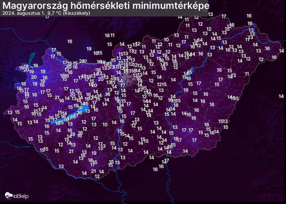 A minimumtérképen kirajzolódik az adott éjszaka mért legalacsonyabb hőmérsékletek térbeli eloszlása. Az adott nap hőmérsékleti minimumát télen előző este 7 és aznap reggel 7 óra, nyáron előző este 8 és aznap reggel 8 óra között mért legalacsonyabb értékkel adjuk meg. Adatbeküldés: aznap délután 4 óráig.