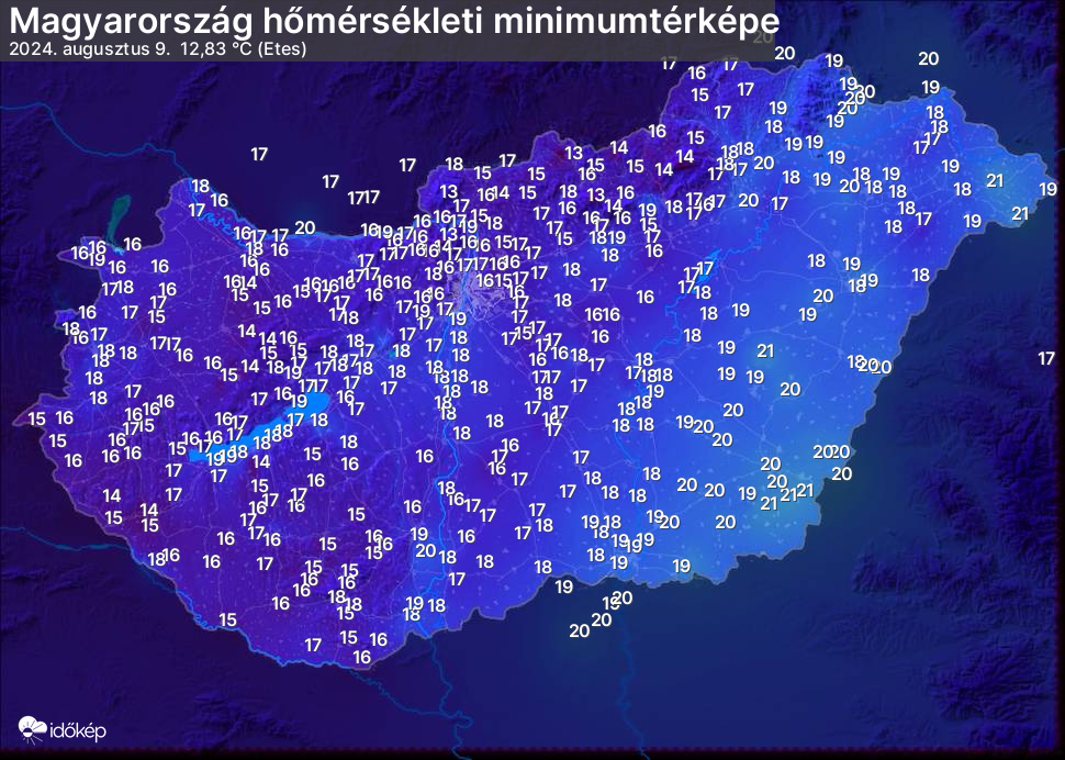 A minimumtérképen kirajzolódik az adott éjszaka mért legalacsonyabb hőmérsékletek térbeli eloszlása. Az adott nap hőmérsékleti minimumát télen előző este 7 és aznap reggel 7 óra, nyáron előző este 8 és aznap reggel 8 óra között mért legalacsonyabb értékkel adjuk meg. Adatbeküldés: aznap délután 4 óráig.