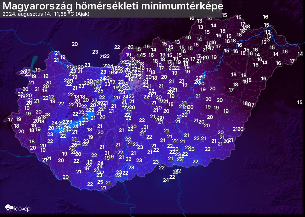 A minimumtérképen kirajzolódik az adott éjszaka mért legalacsonyabb hőmérsékletek térbeli eloszlása. Az adott nap hőmérsékleti minimumát télen előző este 7 és aznap reggel 7 óra, nyáron előző este 8 és aznap reggel 8 óra között mért legalacsonyabb értékkel adjuk meg. Adatbeküldés: aznap délután 4 óráig.