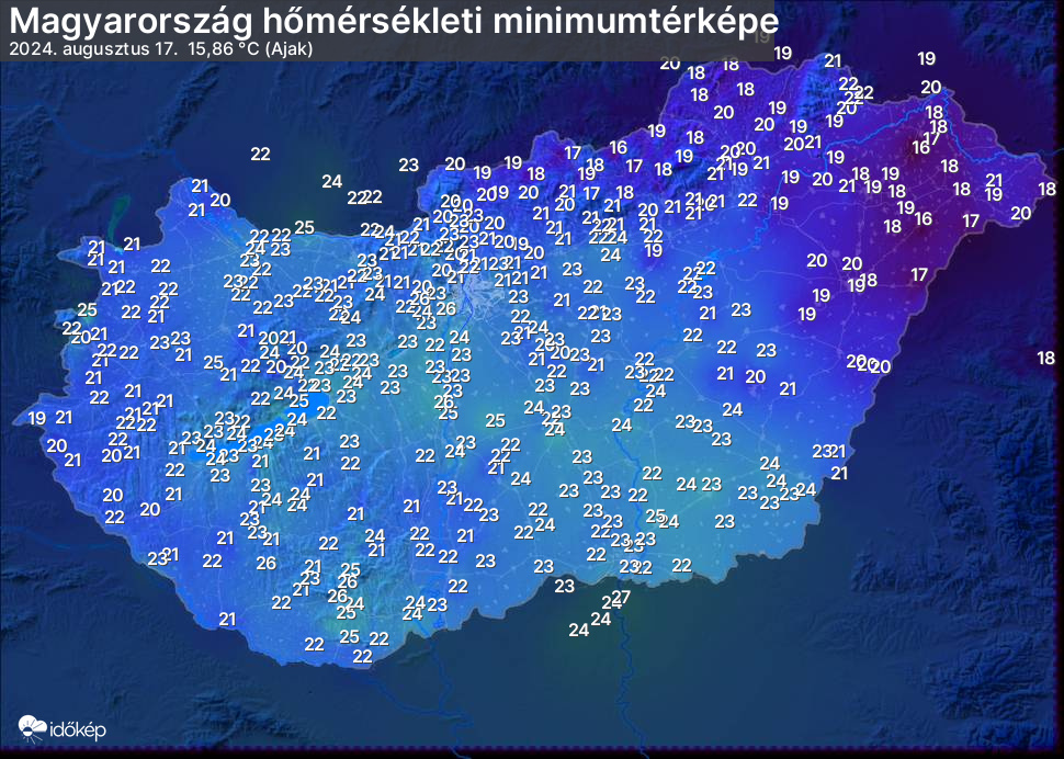 A minimumtérképen kirajzolódik az adott éjszaka mért legalacsonyabb hőmérsékletek térbeli eloszlása. Az adott nap hőmérsékleti minimumát télen előző este 7 és aznap reggel 7 óra, nyáron előző este 8 és aznap reggel 8 óra között mért legalacsonyabb értékkel adjuk meg. Adatbeküldés: aznap délután 4 óráig.
