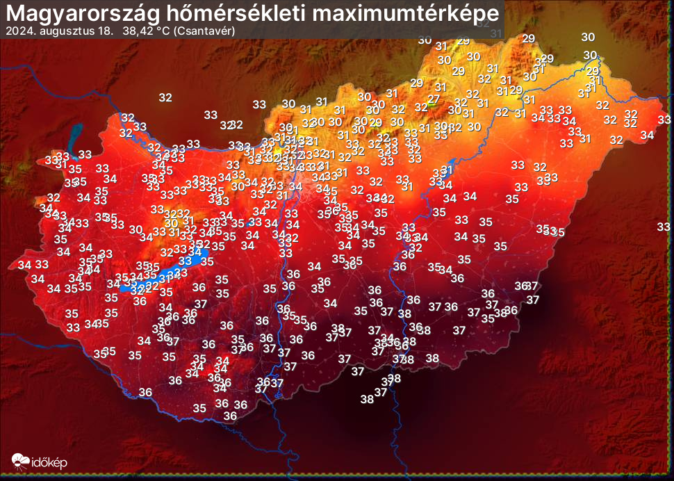 A maximumtérképen kirajzolódik az adott napon mért legmagasabb hőmérsékletek térbeli eloszlása. Az adott nap hőmérsékleti maximumát télen reggel és este 7 óra, nyáron reggel és este 8 óra között mért legmagasabb értékkel adjuk meg. Adatbeküldés: következő nap reggel 4 óráig.