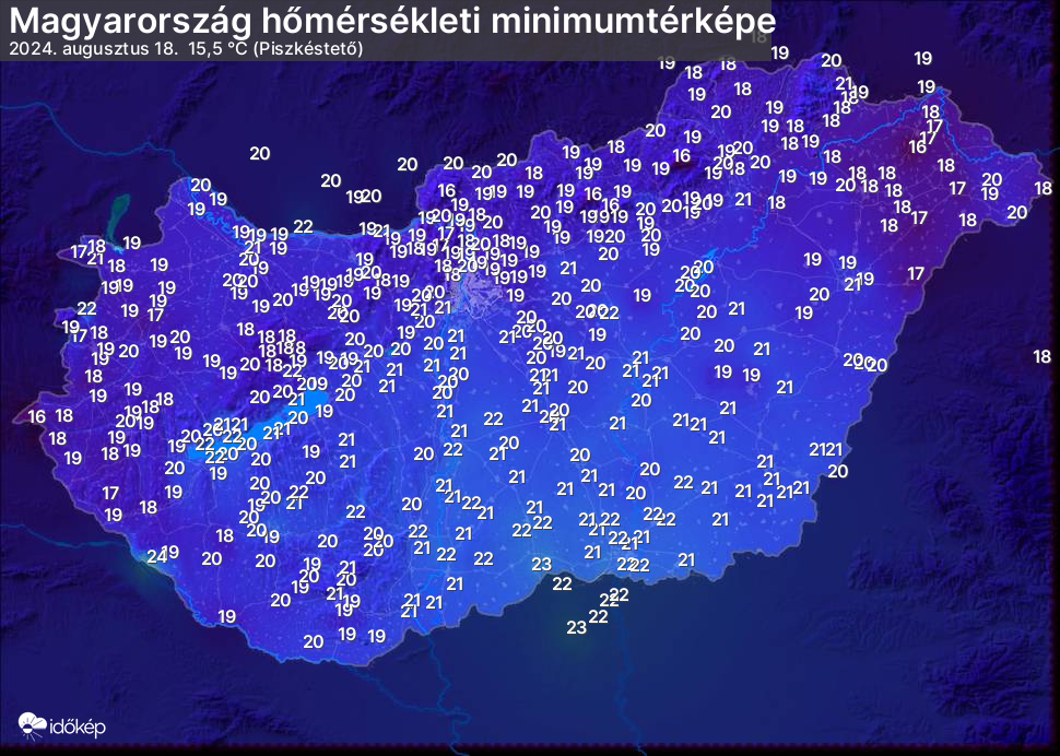 A minimumtérképen kirajzolódik az adott éjszaka mért legalacsonyabb hőmérsékletek térbeli eloszlása. Az adott nap hőmérsékleti minimumát télen előző este 7 és aznap reggel 7 óra, nyáron előző este 8 és aznap reggel 8 óra között mért legalacsonyabb értékkel adjuk meg. Adatbeküldés: aznap délután 4 óráig.