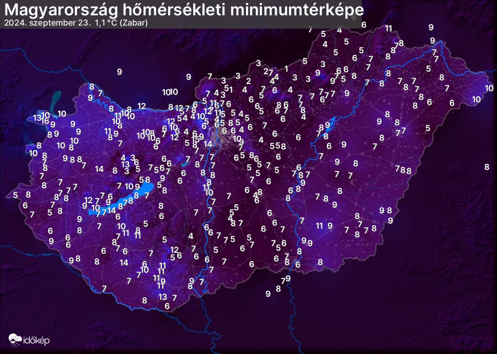 A minimumtérképen kirajzolódik az adott éjszaka mért legalacsonyabb hőmérsékletek térbeli eloszlása. Az adott nap hőmérsékleti minimumát télen előző este 7 és aznap reggel 7 óra, nyáron előző este 8 és aznap reggel 8 óra között mért legalacsonyabb értékkel adjuk meg. Adatbeküldés: aznap délután 4 óráig.