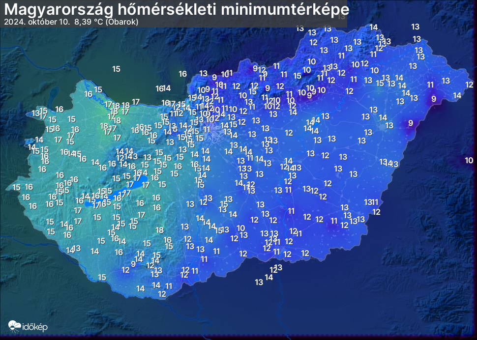 A minimumtérképen kirajzolódik az adott éjszaka mért legalacsonyabb hőmérsékletek térbeli eloszlása. Az adott nap hőmérsékleti minimumát télen előző este 7 és aznap reggel 7 óra, nyáron előző este 8 és aznap reggel 8 óra között mért legalacsonyabb értékkel adjuk meg. Adatbeküldés: aznap délután 4 óráig.