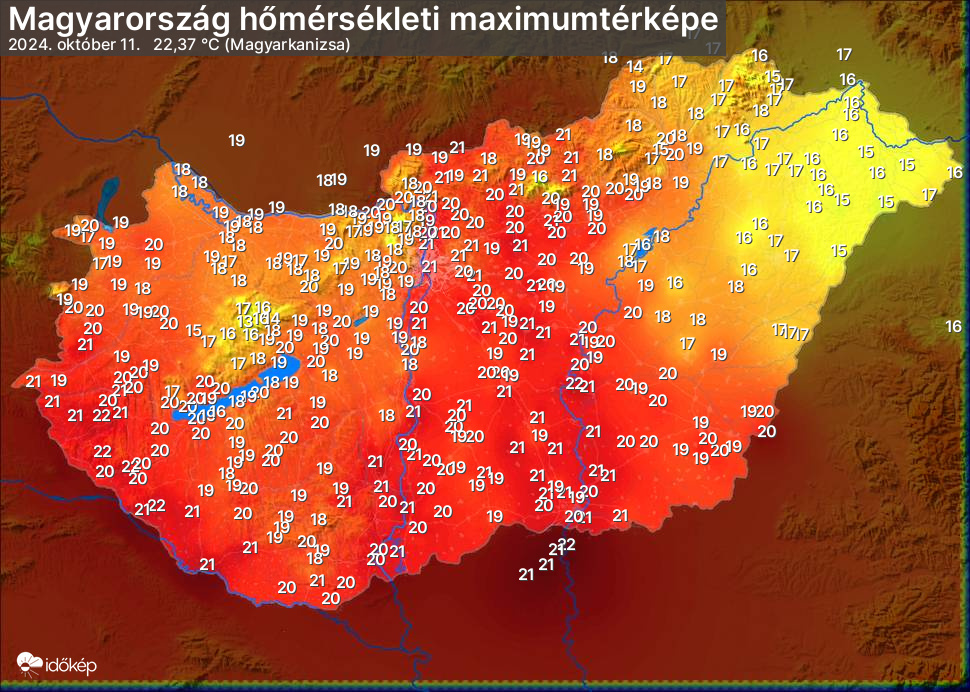 A maximumtérképen kirajzolódik az adott napon mért legmagasabb hőmérsékletek térbeli eloszlása. Az adott nap hőmérsékleti maximumát télen reggel és este 7 óra, nyáron reggel és este 8 óra között mért legmagasabb értékkel adjuk meg. Adatbeküldés: következő nap reggel 4 óráig.