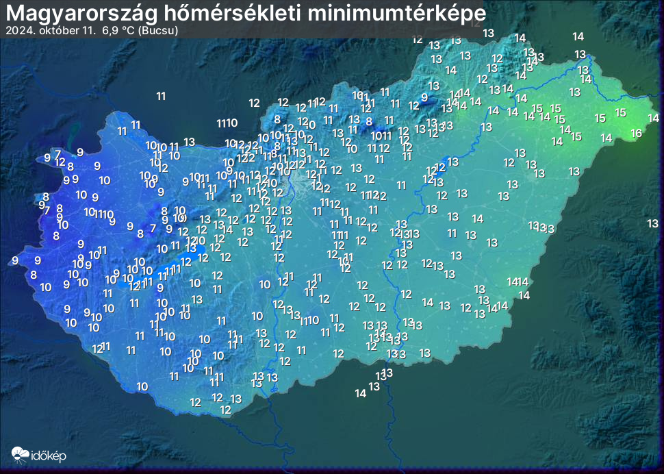 A minimumtérképen kirajzolódik az adott éjszaka mért legalacsonyabb hőmérsékletek térbeli eloszlása. Az adott nap hőmérsékleti minimumát télen előző este 7 és aznap reggel 7 óra, nyáron előző este 8 és aznap reggel 8 óra között mért legalacsonyabb értékkel adjuk meg. Adatbeküldés: aznap délután 4 óráig.