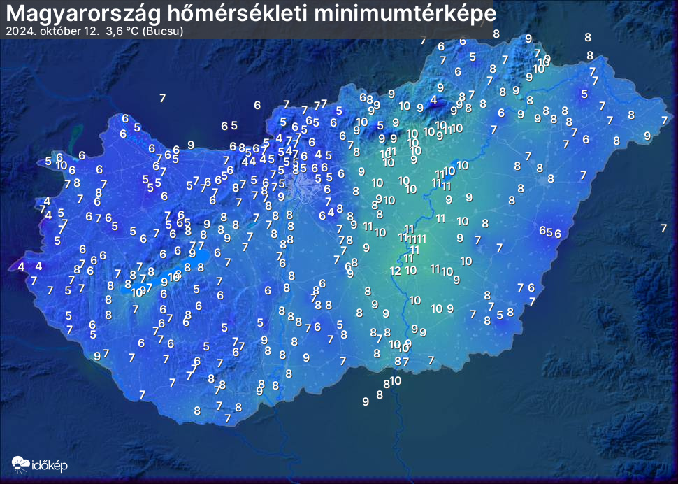A minimumtérképen kirajzolódik az adott éjszaka mért legalacsonyabb hőmérsékletek térbeli eloszlása. Az adott nap hőmérsékleti minimumát télen előző este 7 és aznap reggel 7 óra, nyáron előző este 8 és aznap reggel 8 óra között mért legalacsonyabb értékkel adjuk meg. Adatbeküldés: aznap délután 4 óráig.