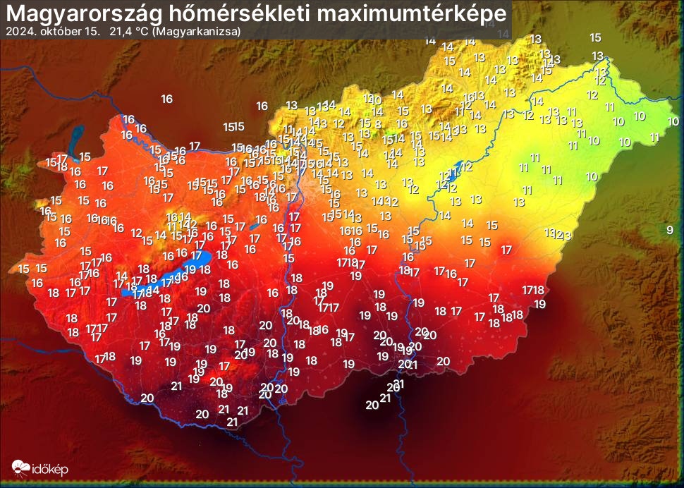 A maximumtérképen kirajzolódik az adott napon mért legmagasabb hőmérsékletek térbeli eloszlása. Az adott nap hőmérsékleti maximumát télen reggel és este 7 óra, nyáron reggel és este 8 óra között mért legmagasabb értékkel adjuk meg. Adatbeküldés: következő nap reggel 4 óráig.
