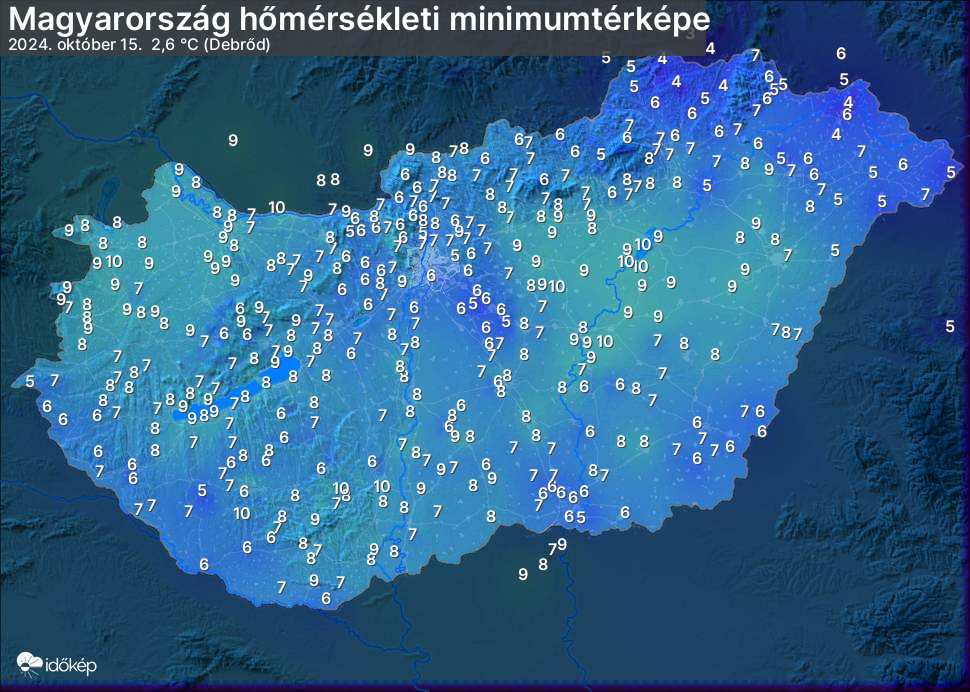 A minimumtérképen kirajzolódik az adott éjszaka mért legalacsonyabb hőmérsékletek térbeli eloszlása. Az adott nap hőmérsékleti minimumát télen előző este 7 és aznap reggel 7 óra, nyáron előző este 8 és aznap reggel 8 óra között mért legalacsonyabb értékkel adjuk meg. Adatbeküldés: aznap délután 4 óráig.