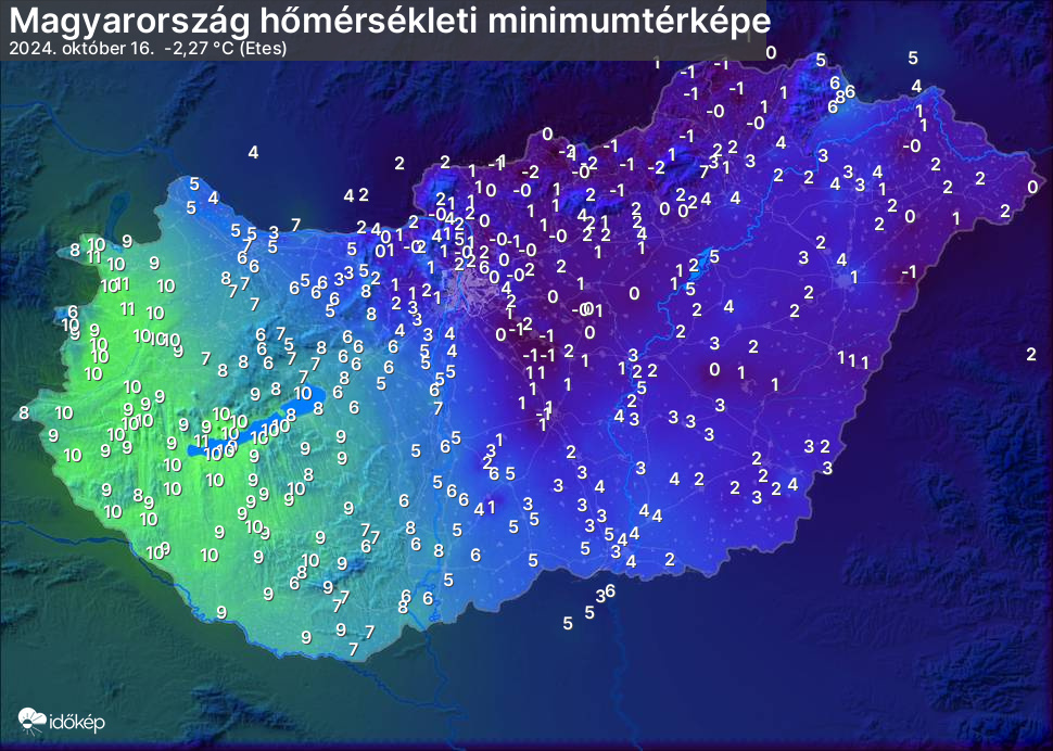 A minimumtérképen kirajzolódik az adott éjszaka mért legalacsonyabb hőmérsékletek térbeli eloszlása. Az adott nap hőmérsékleti minimumát télen előző este 7 és aznap reggel 7 óra, nyáron előző este 8 és aznap reggel 8 óra között mért legalacsonyabb értékkel adjuk meg. Adatbeküldés: aznap délután 4 óráig.