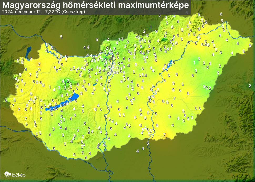 A maximumtérképen kirajzolódik az adott napon mért legmagasabb hőmérsékletek térbeli eloszlása. Az adott nap hőmérsékleti maximumát télen reggel és este 7 óra, nyáron reggel és este 8 óra között mért legmagasabb értékkel adjuk meg. Adatbeküldés: következő nap reggel 4 óráig.