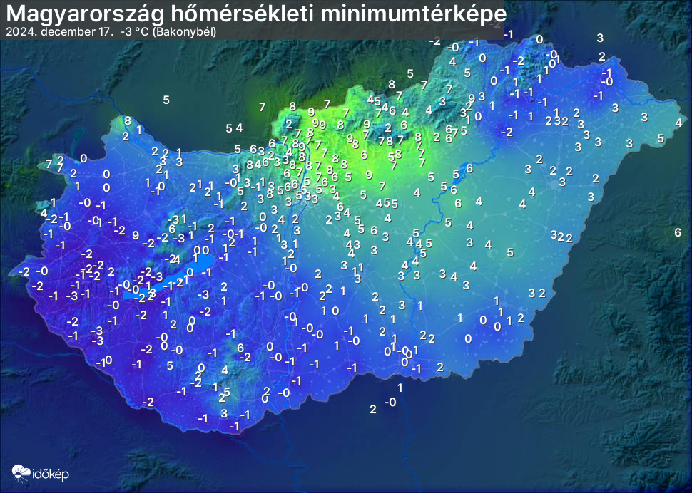 A minimumtérképen kirajzolódik az adott éjszaka mért legalacsonyabb hőmérsékletek térbeli eloszlása. Az adott nap hőmérsékleti minimumát télen előző este 7 és aznap reggel 7 óra, nyáron előző este 8 és aznap reggel 8 óra között mért legalacsonyabb értékkel adjuk meg. Adatbeküldés: aznap délután 4 óráig.