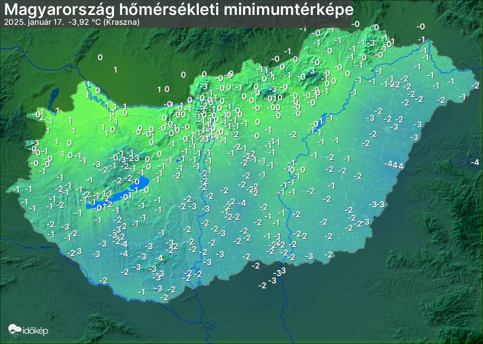 A minimumtérképen kirajzolódik az adott éjszaka mért legalacsonyabb hőmérsékletek térbeli eloszlása. Az adott nap hőmérsékleti minimumát télen előző este 7 és aznap reggel 7 óra, nyáron előző este 8 és aznap reggel 8 óra között mért legalacsonyabb értékkel adjuk meg. Adatbeküldés: aznap délután 4 óráig.