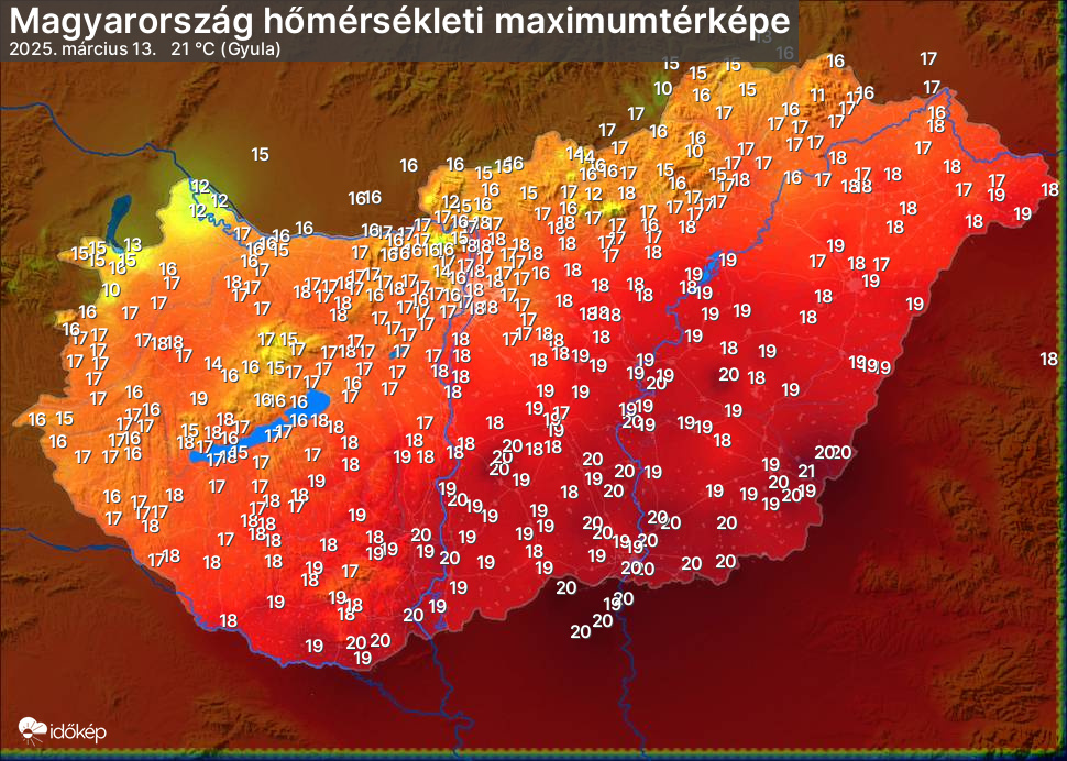 A maximumtérképen kirajzolódik az adott napon mért legmagasabb hőmérsékletek térbeli eloszlása. Az adott nap hőmérsékleti maximumát télen reggel és este 7 óra, nyáron reggel és este 8 óra között mért legmagasabb értékkel adjuk meg. Adatbeküldés: következő nap reggel 4 óráig.