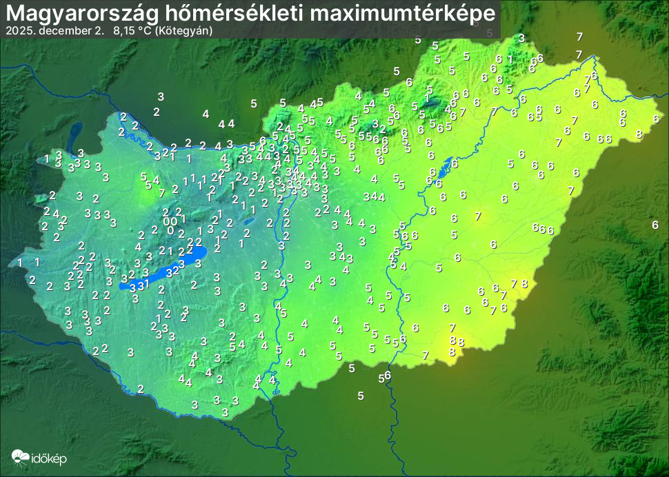 A maximumtérképen kirajzolódik az adott napon mért legmagasabb hőmérsékletek térbeli eloszlása. Az adott nap hőmérsékleti maximumát télen reggel és este 7 óra, nyáron reggel és este 8 óra között mért legmagasabb értékkel adjuk meg. Adatbeküldés: következő nap reggel 4 óráig.