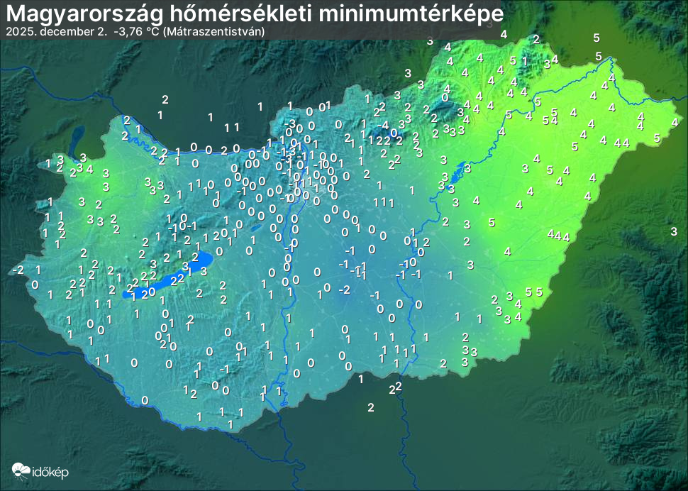 A minimumtérképen kirajzolódik az adott éjszaka mért legalacsonyabb hőmérsékletek térbeli eloszlása. Az adott nap hőmérsékleti minimumát télen előző este 7 és aznap reggel 7 óra, nyáron előző este 8 és aznap reggel 8 óra között mért legalacsonyabb értékkel adjuk meg. Adatbeküldés: aznap délután 4 óráig.