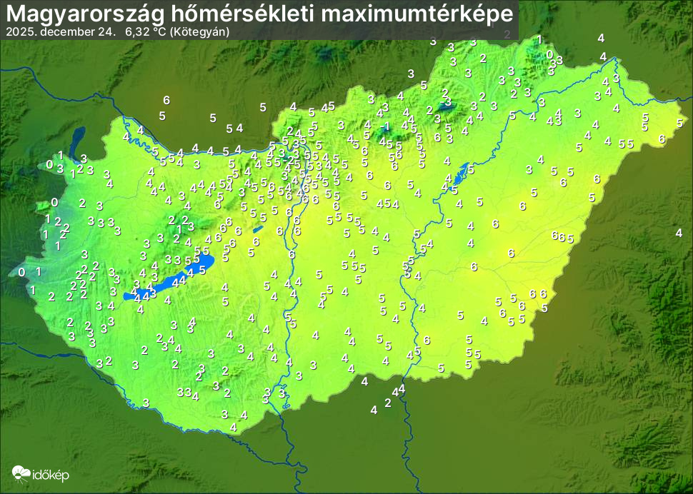 A maximumtérképen kirajzolódik az adott napon mért legmagasabb hőmérsékletek térbeli eloszlása. Az adott nap hőmérsékleti maximumát télen reggel és este 7 óra, nyáron reggel és este 8 óra között mért legmagasabb értékkel adjuk meg. Adatbeküldés: következő nap reggel 4 óráig.