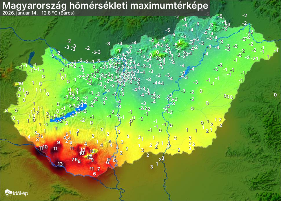 A maximumtérképen kirajzolódik az adott napon mért legmagasabb hőmérsékletek térbeli eloszlása. Az adott nap hőmérsékleti maximumát télen reggel és este 7 óra, nyáron reggel és este 8 óra között mért legmagasabb értékkel adjuk meg. Adatbeküldés: következő nap reggel 4 óráig.