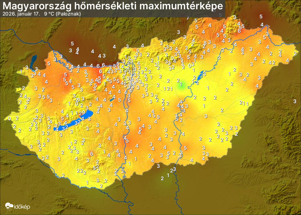 A maximumtérképen kirajzolódik az adott napon mért legmagasabb hőmérsékletek térbeli eloszlása. Az adott nap hőmérsékleti maximumát télen reggel és este 7 óra, nyáron reggel és este 8 óra között mért legmagasabb értékkel adjuk meg. Adatbeküldés: következő nap reggel 4 óráig.