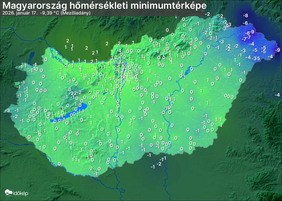A minimumtérképen kirajzolódik az adott éjszaka mért legalacsonyabb hőmérsékletek térbeli eloszlása. Az adott nap hőmérsékleti minimumát télen előző este 7 és aznap reggel 7 óra, nyáron előző este 8 és aznap reggel 8 óra között mért legalacsonyabb értékkel adjuk meg. Adatbeküldés: aznap délután 4 óráig.