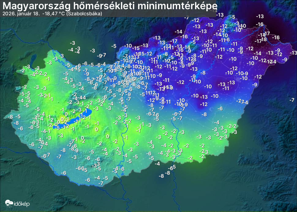 A minimumtérképen kirajzolódik az adott éjszaka mért legalacsonyabb hőmérsékletek térbeli eloszlása. Az adott nap hőmérsékleti minimumát télen előző este 7 és aznap reggel 7 óra, nyáron előző este 8 és aznap reggel 8 óra között mért legalacsonyabb értékkel adjuk meg. Adatbeküldés: aznap délután 4 óráig.