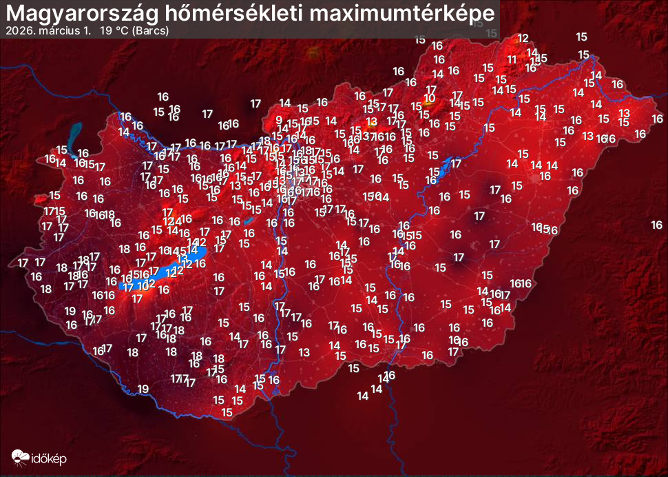 A maximumtérképen kirajzolódik az adott napon mért legmagasabb hőmérsékletek térbeli eloszlása. Az adott nap hőmérsékleti maximumát télen reggel és este 7 óra, nyáron reggel és este 8 óra között mért legmagasabb értékkel adjuk meg. Adatbeküldés: következő nap reggel 4 óráig.