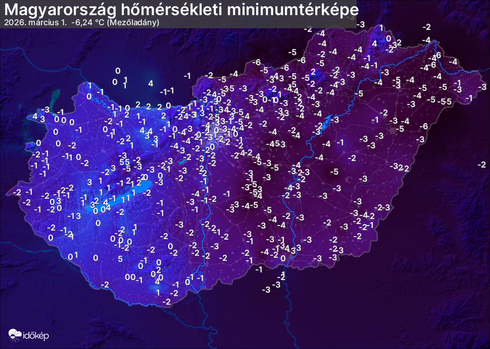 A minimumtérképen kirajzolódik az adott éjszaka mért legalacsonyabb hőmérsékletek térbeli eloszlása. Az adott nap hőmérsékleti minimumát télen előző este 7 és aznap reggel 7 óra, nyáron előző este 8 és aznap reggel 8 óra között mért legalacsonyabb értékkel adjuk meg. Adatbeküldés: aznap délután 4 óráig.