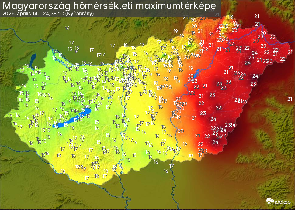A maximumtérképen kirajzolódik az adott napon mért legmagasabb hőmérsékletek térbeli eloszlása. Az adott nap hőmérsékleti maximumát télen reggel és este 7 óra, nyáron reggel és este 8 óra között mért legmagasabb értékkel adjuk meg. Adatbeküldés: következő nap reggel 4 óráig.