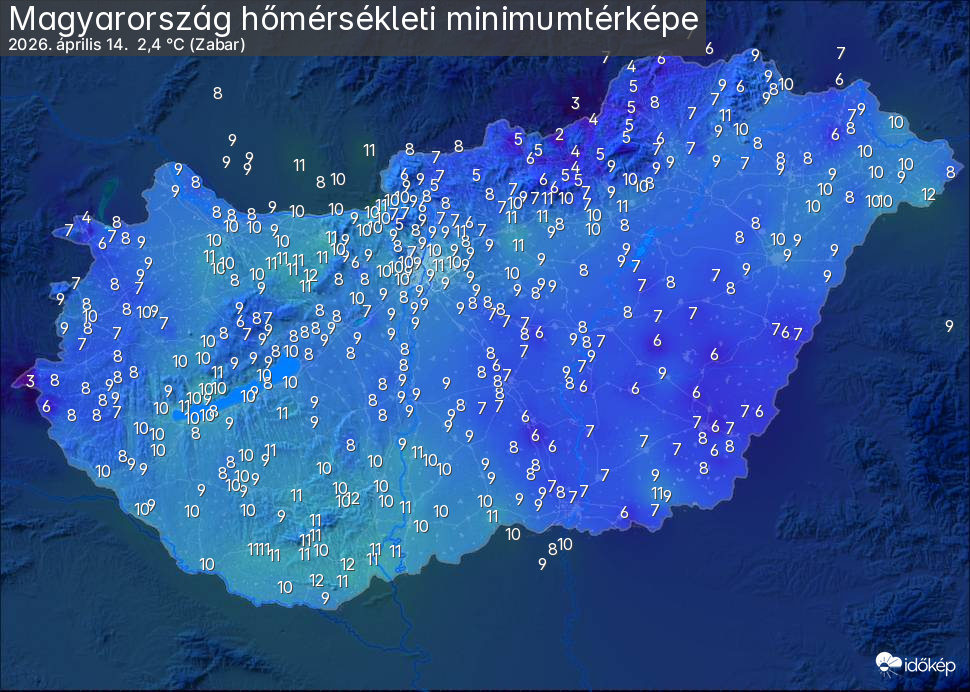 A minimumtérképen kirajzolódik az adott éjszaka mért legalacsonyabb hőmérsékletek térbeli eloszlása. Az adott nap hőmérsékleti minimumát télen előző este 7 és aznap reggel 7 óra, nyáron előző este 8 és aznap reggel 8 óra között mért legalacsonyabb értékkel adjuk meg. Adatbeküldés: aznap délután 4 óráig.