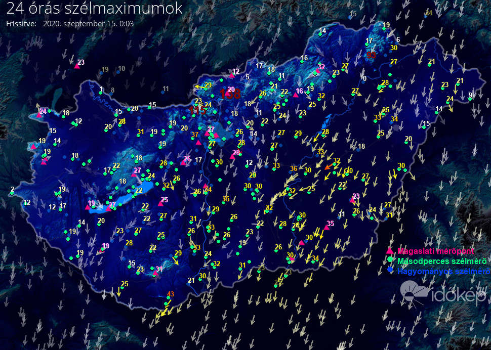 Térképünkön az elmúlt napon született legmagasabb szélerősség értéket jelenítjük meg.