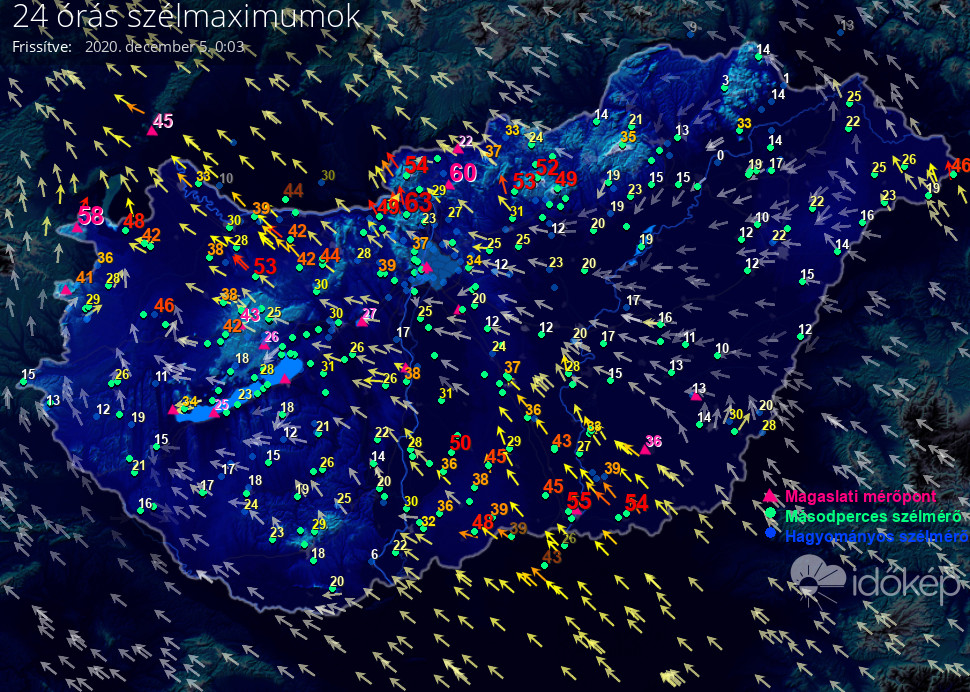 Térképünkön az elmúlt napon született legmagasabb szélerősség értéket jelenítjük meg.