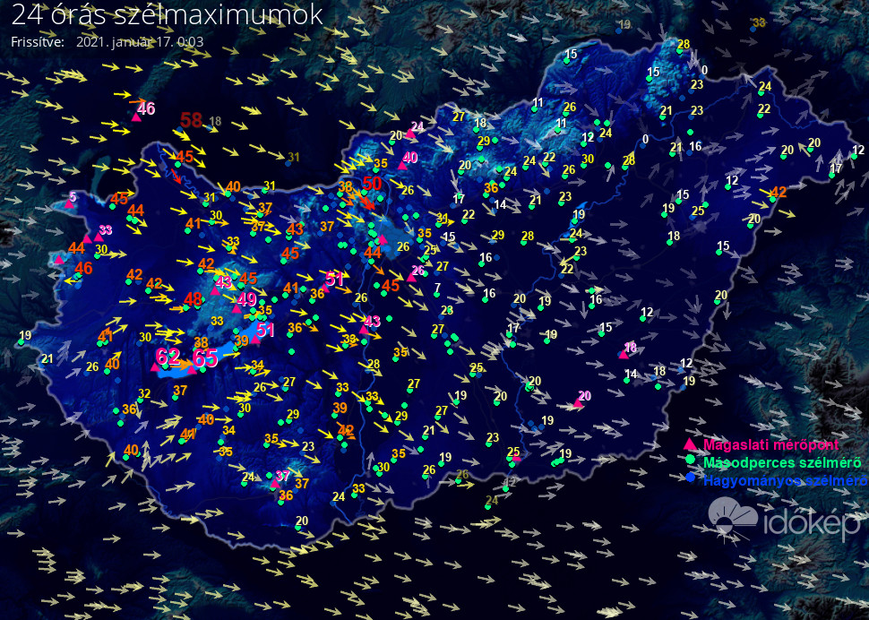 Térképünkön az elmúlt napon született legmagasabb szélerősség értéket jelenítjük meg.