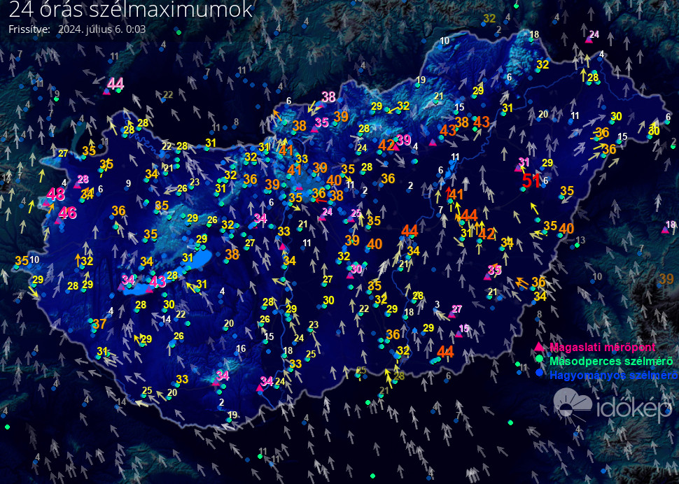 5 percenként frissítve, az elmúlt 24 óra méréseiből,
